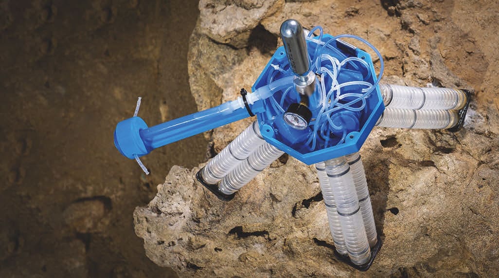 The robot is also equipped with simple mechanical sensors — little soft bubbles filled with fluid placed at the end of booms protruding from the robot’s body. When the bubbles are depressed, the fluid flips a valve in the robot that causes it to reverse direction. The robot is equipped with three valves acting as inverters that cause a high-pressure state to spread around the air-powered circuit, with a delay at each inverter.
