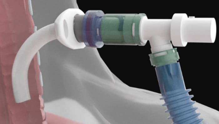 This device eliminates deadly accidental ventilator “pop-off” disconnect events. The FDA 510(k)-cleared tracheostomy tube sets include a patented ventilator elbow connector and overpressure relief safety valve.