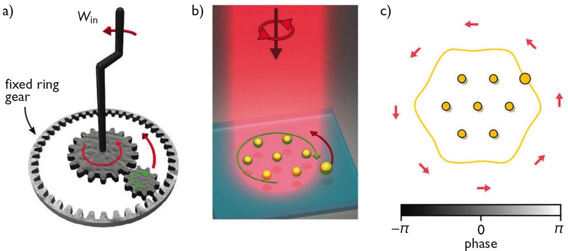 In the new work, they created an optical matter machine that operates much like a mechanical machine based on interlocking gears. In such machines, when one gear is turned, a smaller interlocking gear will spin in the opposite direction. The optical matter machine uses circularly polarized light from a laser to create a nanoparticle array that acts like the larger gear by spinning in the optical field. This “optical matter gear” converts the circularly polarized light into orbital, or angular, momentum that influences a nearby probe particle to orbit the nanoparticle array (the gear) in the opposite direction.