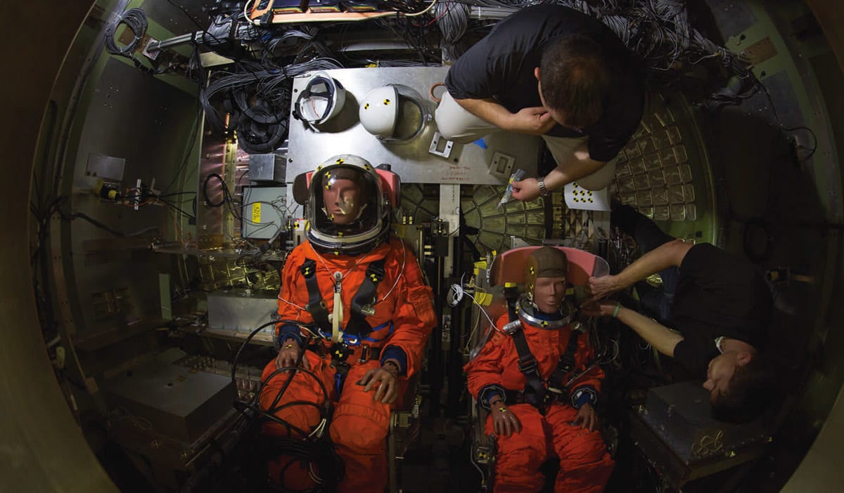 At NASA’s Langley Research Center, crash-test dummies are outfitted with suits and sensors and then secured in an Orion test article before being dropped into the Hydro Impact Basin. The drop tests help engineers assess and mitigate potential injuries to crew from splashdown. (NASA)