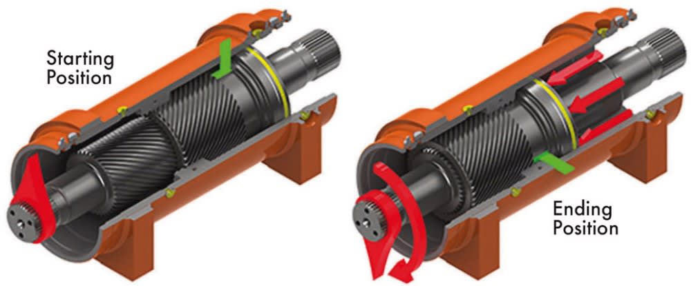 The actuator used in the sprayer retrofit is composed of three basic parts: a housing, a central through-shaft, and an annular piston. Helical gear teeth on the shaft mesh with matching teeth on the inner circumference of the piston; the second set of helical teeth of opposite hand on the outer circumference of the piston engage the housing’s integral ring gear. The double-helix gear design works to compound shaft rotation. The rotation of the shaft is almost twice that of the piston. The result is a slender, compact, symmetrical design that generates high torque, is highly tolerant of shock loads, and has none of the house protrusions found in alternative designs.