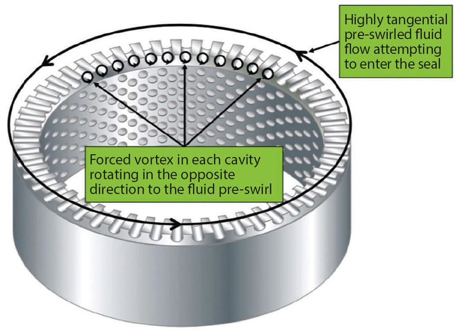 A top priority in rotor dynamic design, therefore, is to develop devices to minimize the level of fluid pre-swirl entering tight clearance locations. Researchers have developed the Reverse Vortex Ring (RVR), a mechanism for improving rotordynamic stability and response in turbomachinery.