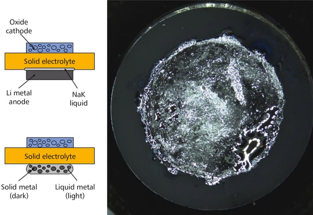 In a second version of the solid battery, the team introduced a very thin layer of liquid sodium potassium alloy in between a solid lithium electrode and a solid electrolyte. They showed that this approach could also overcome the dendrite problem, providing an alternative approach for further research.