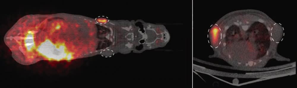In microscopy, fluorescent dyes are used to label cells, but they are mostly not suitable for whole-body imaging because their signals are scattered by thicker tissue layers with the result that they can no longer be measured. To solve this problem, the scientists synthesized a new SNAP-tag substrate using the radioactive signal emitter fluorine-18. The team has successfully labelled tumor cells in mice by injecting this substrate into the organism via the bloodstream. They were then able to visualize the tumors using PET imaging.