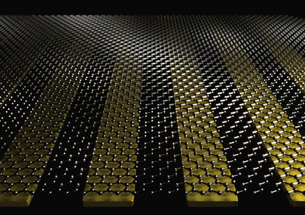 Researchers have combined graphene with nano-sized metal ribbons of gold. Using sticky tape and a nanofabrication technique called “template stripping,” they were able to create an ultra-flat base layer surface for the graphene. The energy of light was then used to generate a sloshing motion of electrons in the graphene, called plasmons, which are like ripples or waves spreading through a sea of electrons. Similarly, these waves can build in intensity to giant tidal waves of local electric fields.