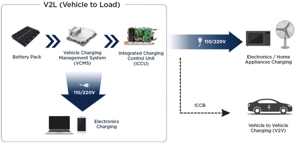 Hyundai’s Ioniq 5 has somewhat more limited bi-directional power capability (at 77 kWh its battery is smaller than that expected for the F-150 Lightning), but can be used to power small appliances and other equipment or charge another EV. This vehicle-to-load (V2L) functionality also has been demonstrated by other automakers and is projected to be promoted as an EV advantage over internalcombustion power.