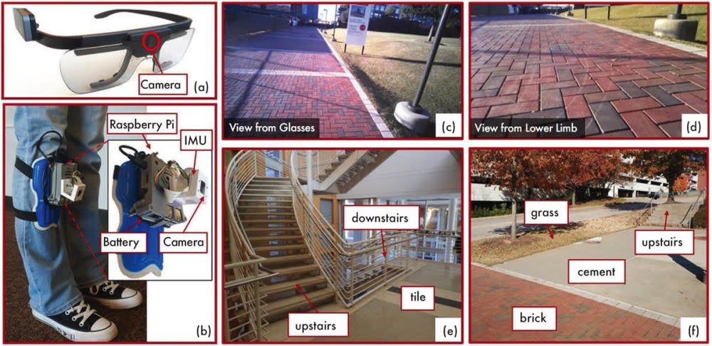 The researchers focused on distinguishing among six different terrains that require adjustments in a robotic prosthetic’s behavior: tile, brick, concrete, grass, “upstairs,” and “downstairs.” The new “environmental context” framework incorporates both hardware and software elements. The researchers designed the framework for use with any lower-limb robotic exoskeleton or robotic prosthetic device but with one additional piece of hardware: a camera. They used cameras worn on eyeglasses and cameras mounted on the lower-limb prosthesis itself and evaluated how the AI was able to make use of computer vision data from both types of camera, separately and when used together.