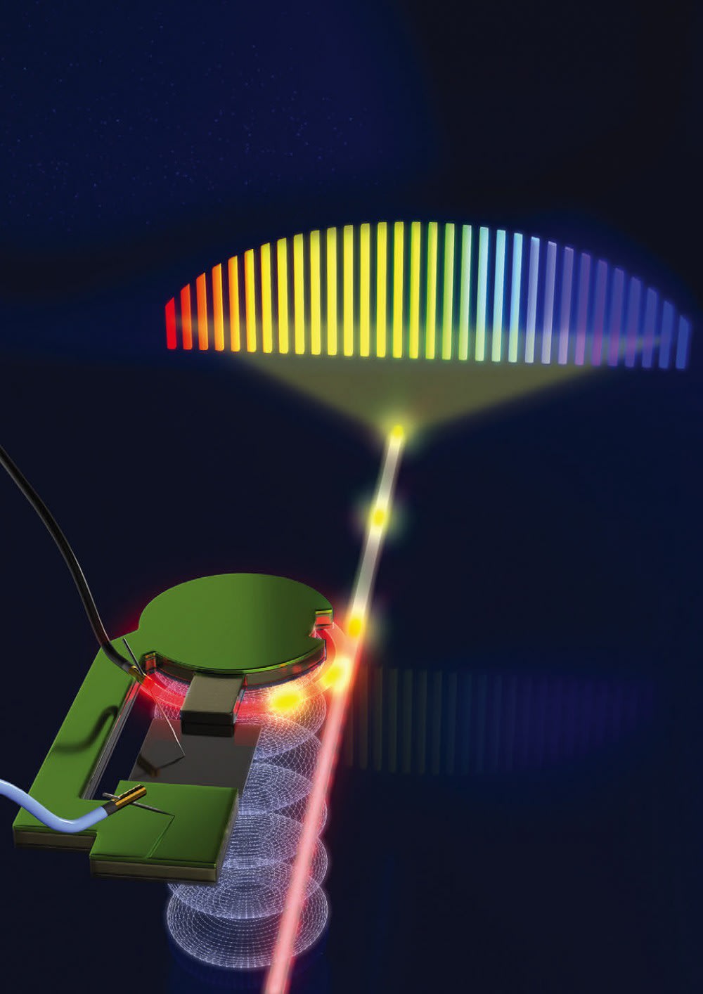 The technology integrates microelectromechanical systems (MEMS) transducers made of aluminum nitride to modulate the microcomb at high frequencies ranging from megahertz to gigahertz. An array of phased MEMS transducers, also used in cellphones to discern cellular bands, stirs light at gigahertz frequencies by launching a corkscrew-like stress wave into a silicon chip. The stirring motion modulates light such that it can only travel in one direction.