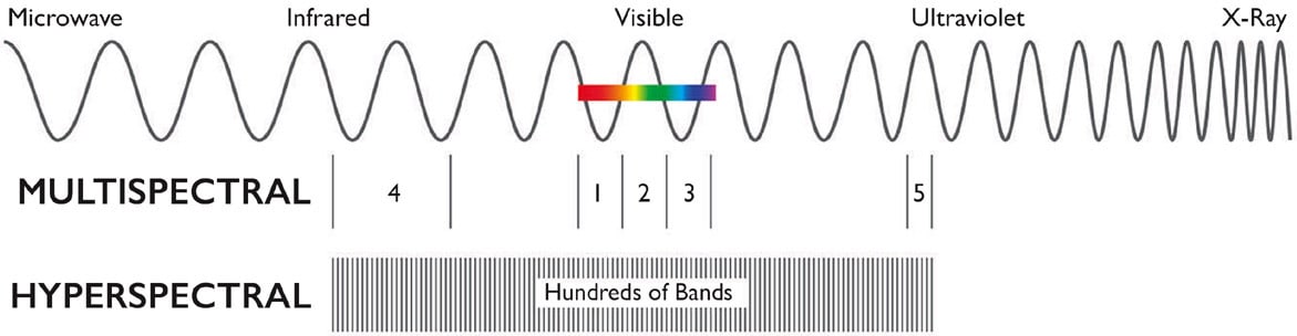 Humans see color as combinations of red (1), green (2), and blue (3) in a very small region of the electromagnetic spectrum. The addition of bands 4 and 5 represent a multispectral example, where more than 3 areas of the spectrum are captured and analyzed. Hyperspectral imaging utilizes hundreds of bands of the spectrum instead of just a few. This enables the high performance of a point-measurement spectrometer but at each pixel of an image that could consist of millions of pixels.