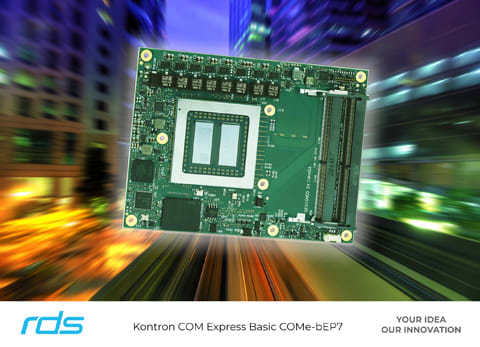 Review Display Systems Inc. (RDS) (Milwaukee, WI) announced the availability of a new Kontron COM Express Basic Type 7 Computer-On-Module. The industrial specification COMe-bEP7 features AMD EPYC embedded 3000 SoC processors and offers scalable performance with up to sixteen processor cores. Four optional SODIMM sockets provide up to 128 GB DDR4 RAM of memory. Networking capabilities and connectivity are supported with four 10 Gb Ethernet interfaces and up to 32 PCIe Gen 3 lanes. Two SATA ports are provided, with the option to integrate an onboard NVMe if required. The industrial-grade COMe-bEP7 module can operate in extreme temperature environments from -40°C to +85°C. Onboard peripheral support includes four USB 3.1, four USB 2.0 as well as LPC, SPI Flash, SMB, dual staged Watchdog and RTC.