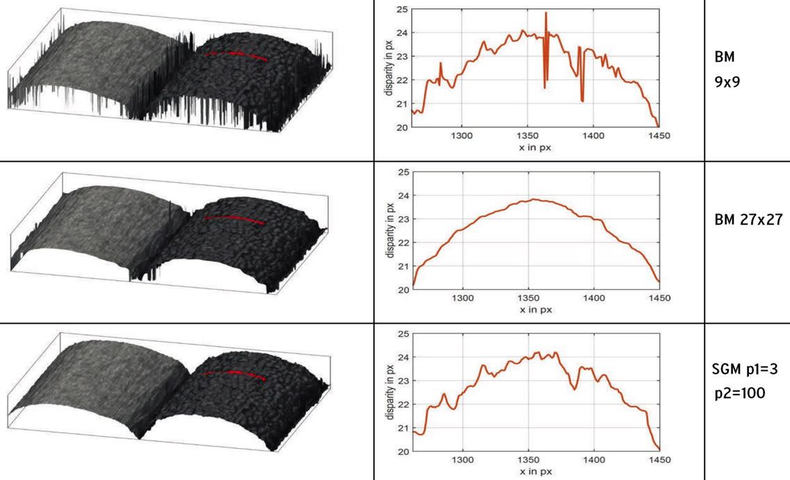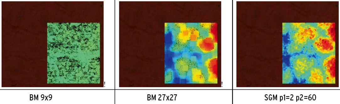 In the illustration of scan data of a 3D textured technical fabric shown in Figure 2, the false color overlay indicates the reconstructed image height. Black values in the BM result image indicates pixel positions for which height could not be reconstructed due to missing texture information. By using a larger block matching window size, the amount of pixel that cannot be reconstructed is reduced considerably but blocking artifacts typical for BM are introduced. Using SGM, detailed image height is reconstructed without artifacts.