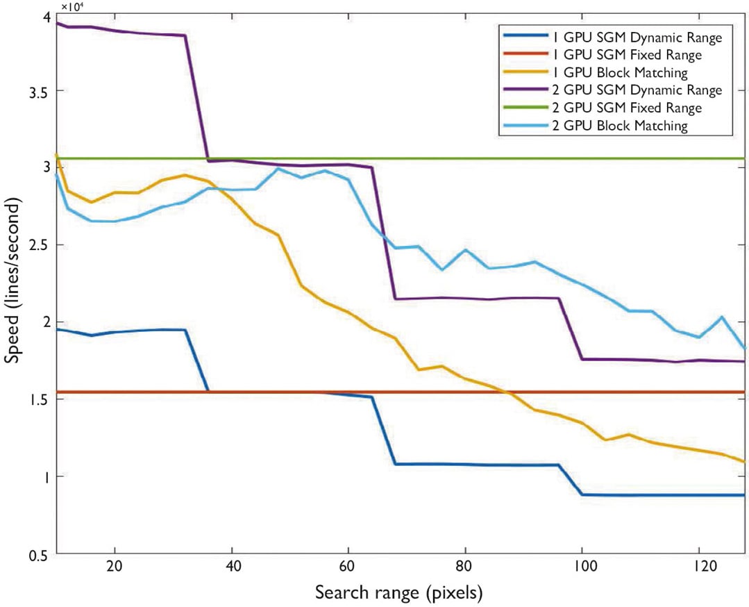 We can see that with SGM method, using 2 GPUs clearly outperforms using only 1 GPU and is highly recommended. With large search range (larger than 64 for example), fixed height range mode outperforms dynamic height range mode.