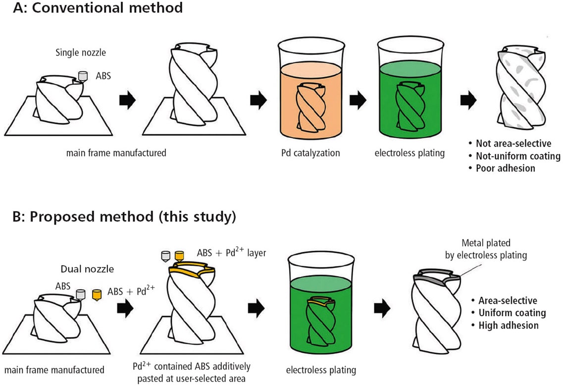 In contrast, in the new hybrid method, a printer with a dual nozzle is used; one nozzle extrudes standard melted plastic (acrylonitrile butadiene styrene, or ABS) whereas the other extrudes ABS loaded with PdCl2. By selectively printing layers using one nozzle or the other, specific areas of the 3D object are loaded with Pd. Then, through electroless plating, one finally obtains a plastic structure with a metallic coating over selected areas only.