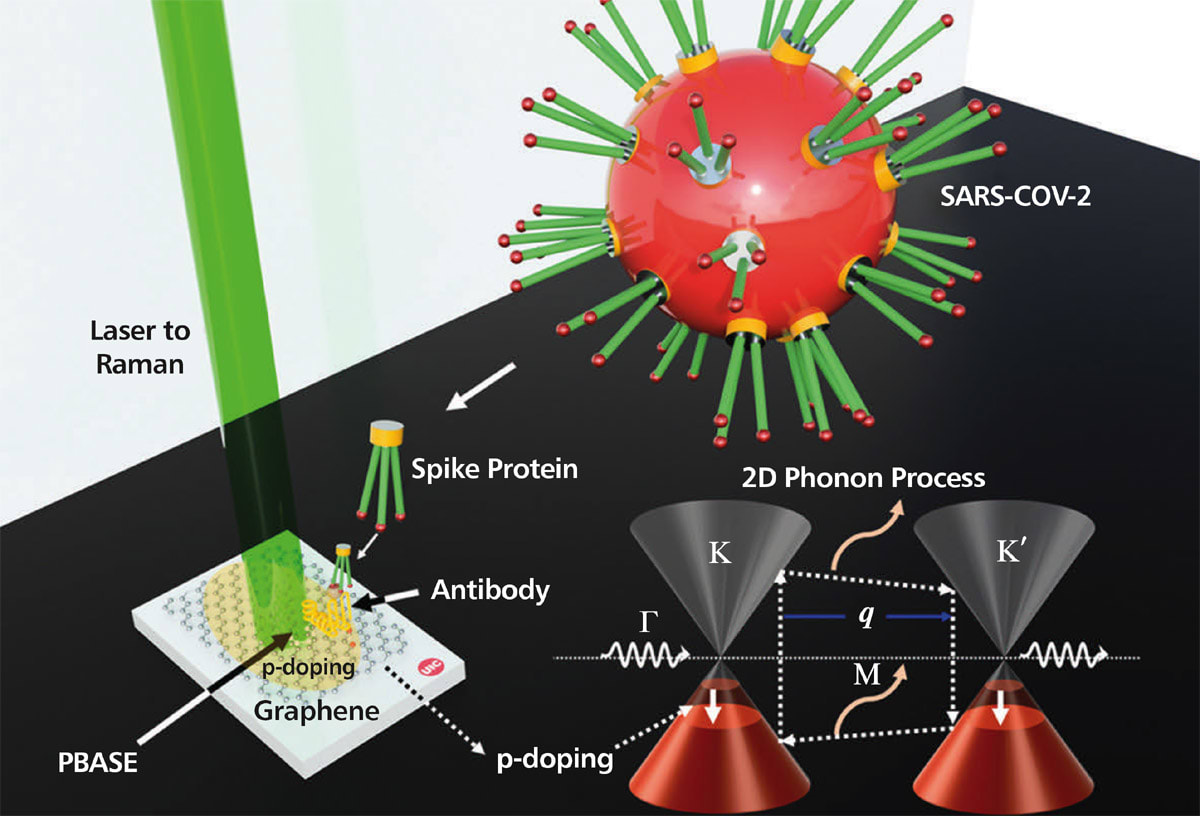 The vibrations of the antibody-coupled graphene sheet changed when treated with a COVID-positive sample but not when treated with a COVID-negative sample or with other coronaviruses. Vibrational changes, measured with a Raman spectrometer, were evident in less than five minutes.