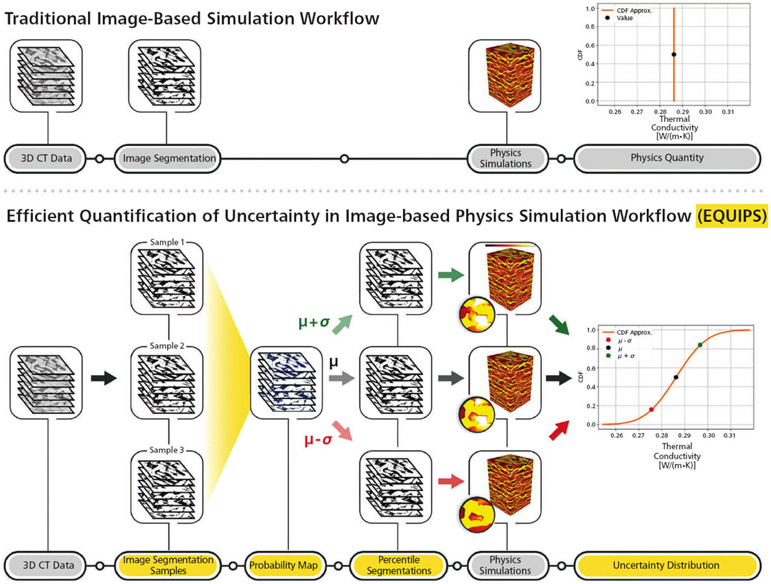 EQUIPS can employ two types of machine learning techniques — Monte Carlo Dropout Networks and Bayesian Convolutional Neural Networks — to perform image segmentation, with both approaches creating a set of image segmentation samples. These samples are combined to map the probability that a certain pixel or voxel is in the segmented material. To explore the impact of segmentation uncertainty, EQUIPS creates a probability map to obtain segmentations, which are then used to perform multiple simulations and calculate uncertainty distributions.