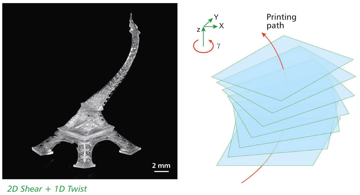 Most conventional 3D printing processes rely on replicating a digital design model that is sliced into layers with the layers printed and assembled upward like a cake. A new method introduces the ability to manipulate the original design layer-by-layer and pivot the printing direction without recreating the model. This “on-the-fly” feature enables the printing of more complicated structures and significantly improves manufacturing flexibility.