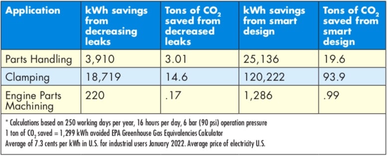 As an example, consider the three automotive applications in Figure 1: parts handling, clamping, and engine part machining. Energy savings and carbon dioxide (CO2) emissions reduction through leakage eradication alone is compared to energy savings from leakage eradication combined with seven other smart design concepts. The additional energy conservation tactics are reduced pressure, correct sizing, reduced tubing lengths, reduced pressure loss, recovered energy, remove power when the machine is idle, and air saving circuits. The total savings are up to six times greater with combined smart design concepts than through leakage eradication alone.