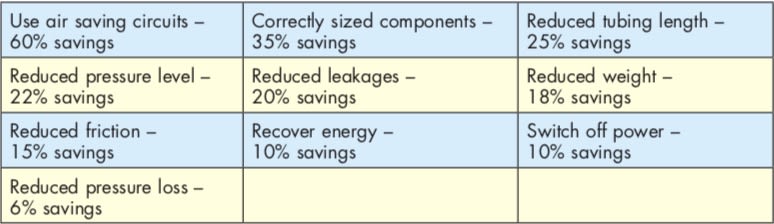 At many facilities, the primary method of reducing pneumatic machine or cell energy consumption is to reduce air leaks. In any given application, stopping leaks can result in a reduction in lost energy from 10 percent to 20 percent. Leakage reduction, however, is only one of many ways to drive waste out of a pneumatic system.