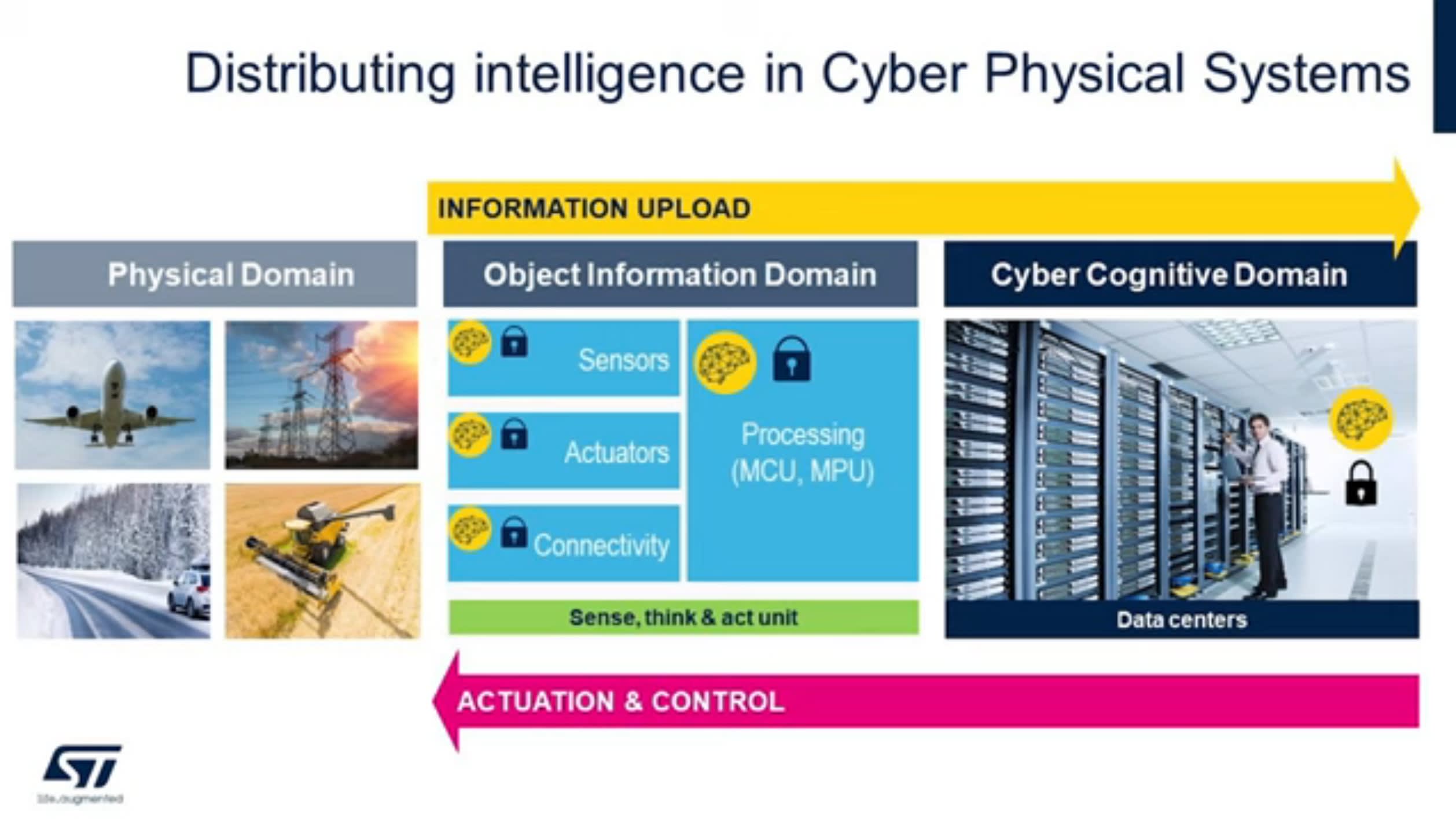 There is a common system architecture in all these applications — Cyber Physical Systems (CPS). A CPS collects data, sends it raw or pre-processed to the Cyber Cognitive Domain (the cloud), where it is manipulated to extract information and make decisions. The elaborated result is sent back to real-world physical systems — the Physical Domain — to guide appropriate actions.