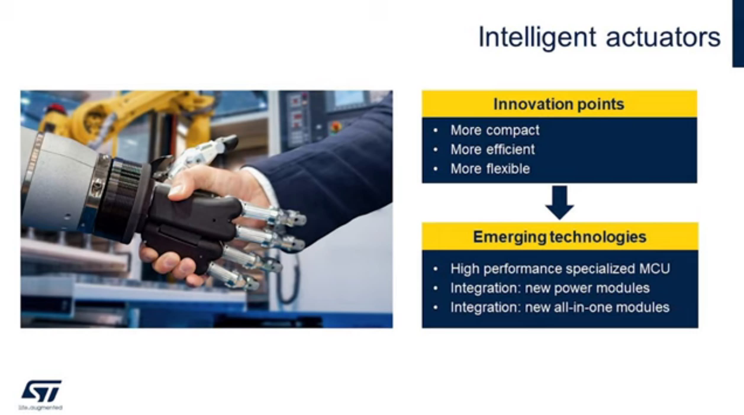 There is an evolution towards ever more intelligent actuators that are more compact, more efficient, and more flexible. This is driving emerging technologies such as specialized microcontrollers with new sensors and new analog frontend solutions for a more flexible system.
