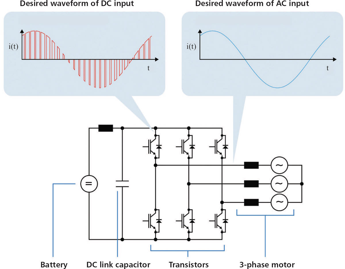 The role of the inverter in an automotive drivetrain is simple in concept, but complex in practice. The inverter must satisfy the AC demands of the motor with the DC provided by the battery, but it must also adjust to ongoing fluctuations in load, charge, temperature, and other factors that can affect the behavior of each part of the system. All of this must occur within tight cost and spatial constraints, and the component must sustain this performance for years to come (Figure 1).