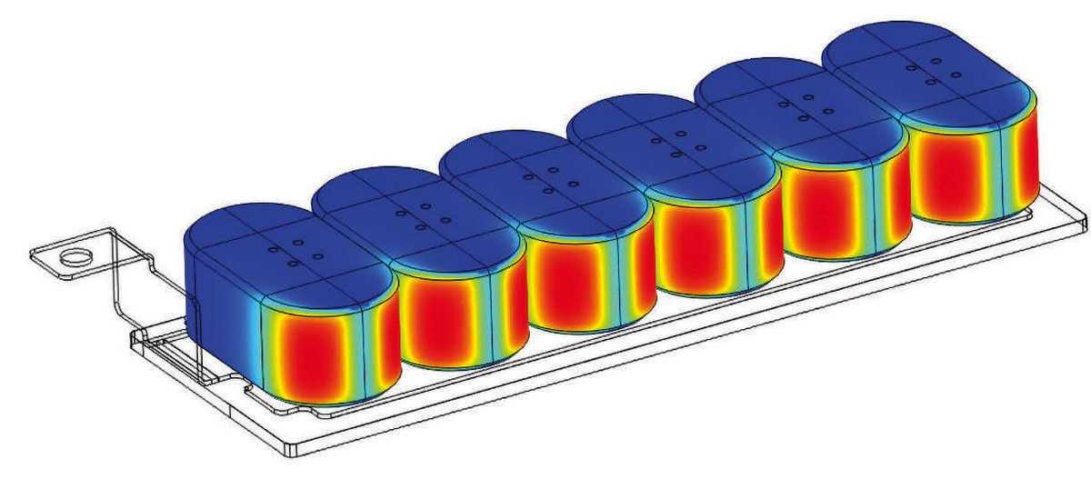To meet the design challenges of a DC link capacitor, Kessler developed a process that combines experimental testing with multiphysics simulation. As an example of why simulation-based analysis is a necessary part of his work, he cites the difficulty of finding and measuring potential hot spots, where high heat and coupled effects can cause failures. “We try to locate hot spots by placing a lot of thermocouples inside prototypes and measuring temperatures at various load points,” Kessler said.