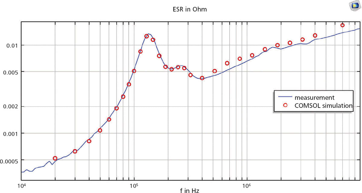 “We perform EM modeling and validation of every new design. We compare the calculated equivalent series resistance (ESR) curve with the ESR curve as measured from a prototype (Figure 6). If these curves are aligned, we can set up boundary conditions for stationary and transient heat calculations,” said Kessler. “We can compare the temperature curves from our thermocouples with the results of probes in the COMSOL Multiphysics® model. If they match, we can then simulate all the critical points where we must keep temperatures within limits.” The curve data is put into the COMSOL Multiphysics® software via the LiveLink ™ for MATLAB® interfacing product.