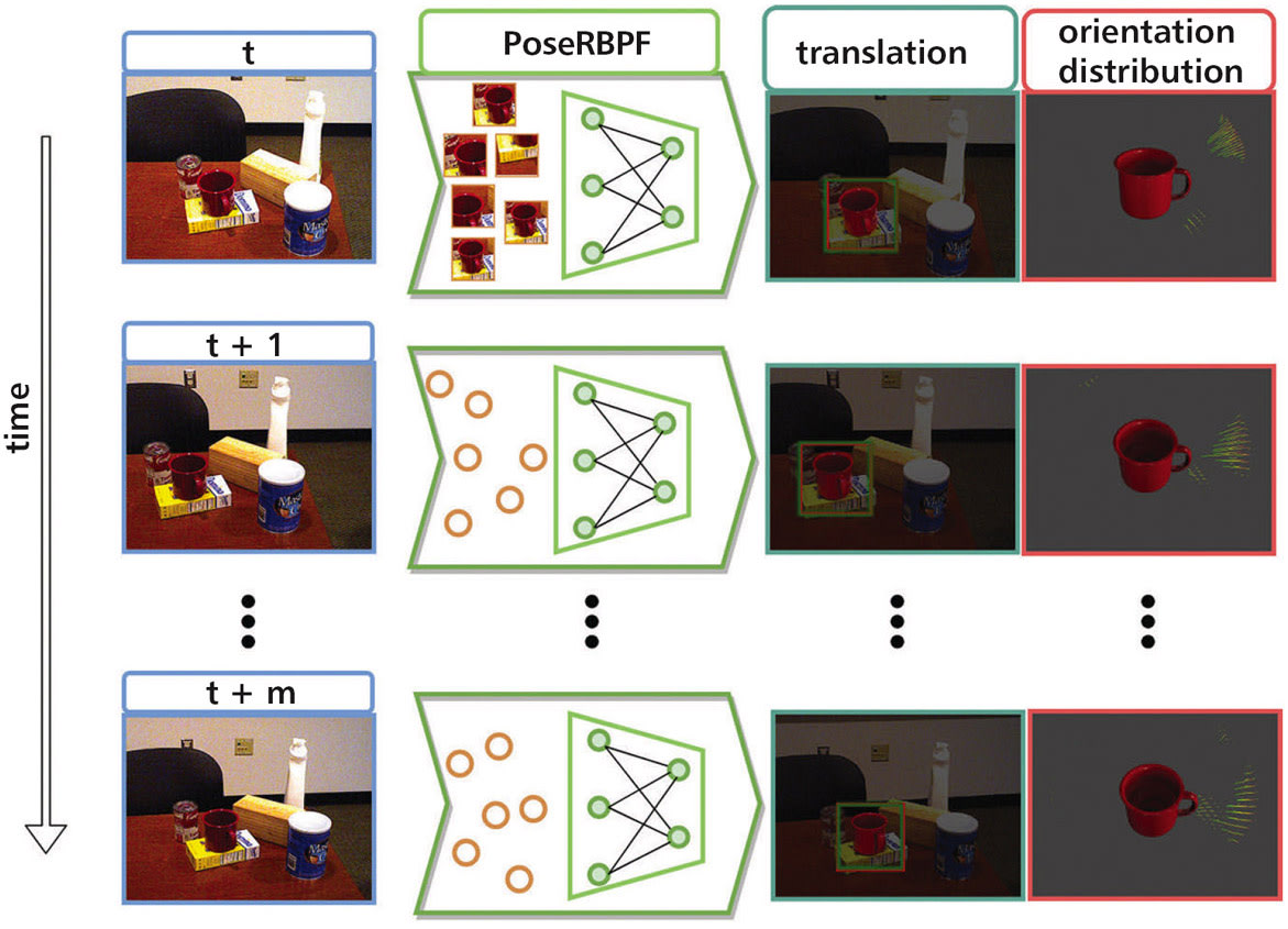 Previously, there was no system to estimate the full distribution of the orientation of the object. This gives important uncertainty information for robot manipulation. The new filter uses 6D object pose tracking in the Rao-Blackwel-lized particle filtering framework, where the 3D rotation and the 3D translation of an object are separated. This allows the new approach, called PoseRBPF, to efficiently estimate the 3D translation of an object along with the full distribution over the 3D rotation. As a result, Pose-RBPF can track objects with arbitrary symmetries while still maintaining adequate posterior distributions.