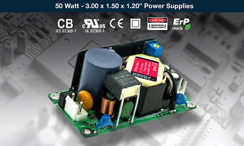 TRACO POWER, San Jose, CA, announces their new TPI 50A-J series of 50W high-density AC/DC power supplies available in 3.00 x 1.50 x 1.20" open frame packages for a wide range of industrial and ITE applications where reliability is critical and space is limited. It is designed to meet the need for cost-efficient solutions and reduced footprints. The 140 percent peak power enables replacement of units nearly twice its size.