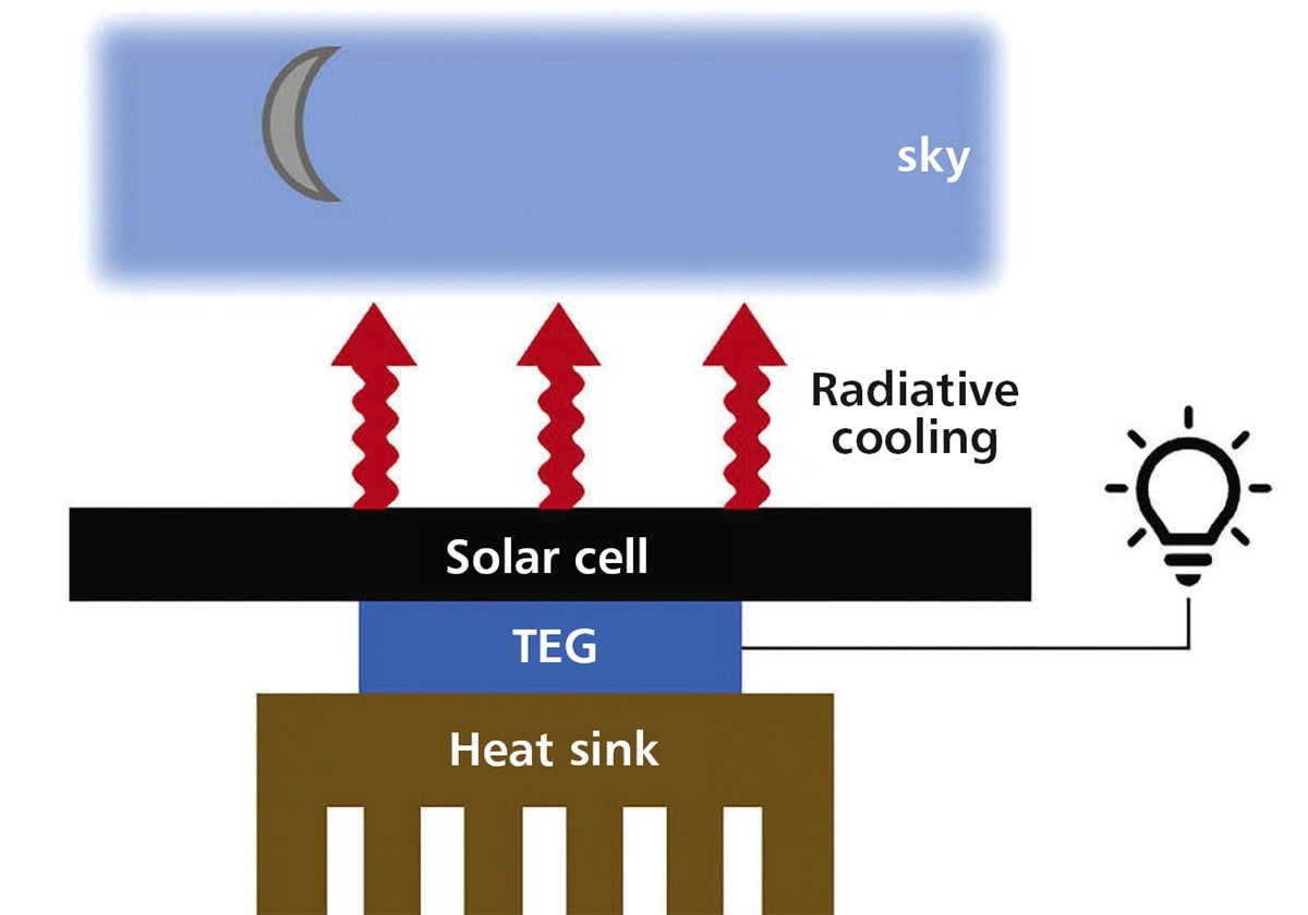 At night, solar cells radiate and lose heat to the sky, reaching temperatures a few degrees below the ambient air. The device under development uses a thermoelectric module to generate voltage and current from the temperature gradient between the cell and the air. This process depends on the thermal design of the system, which includes a hot side and a cold side.