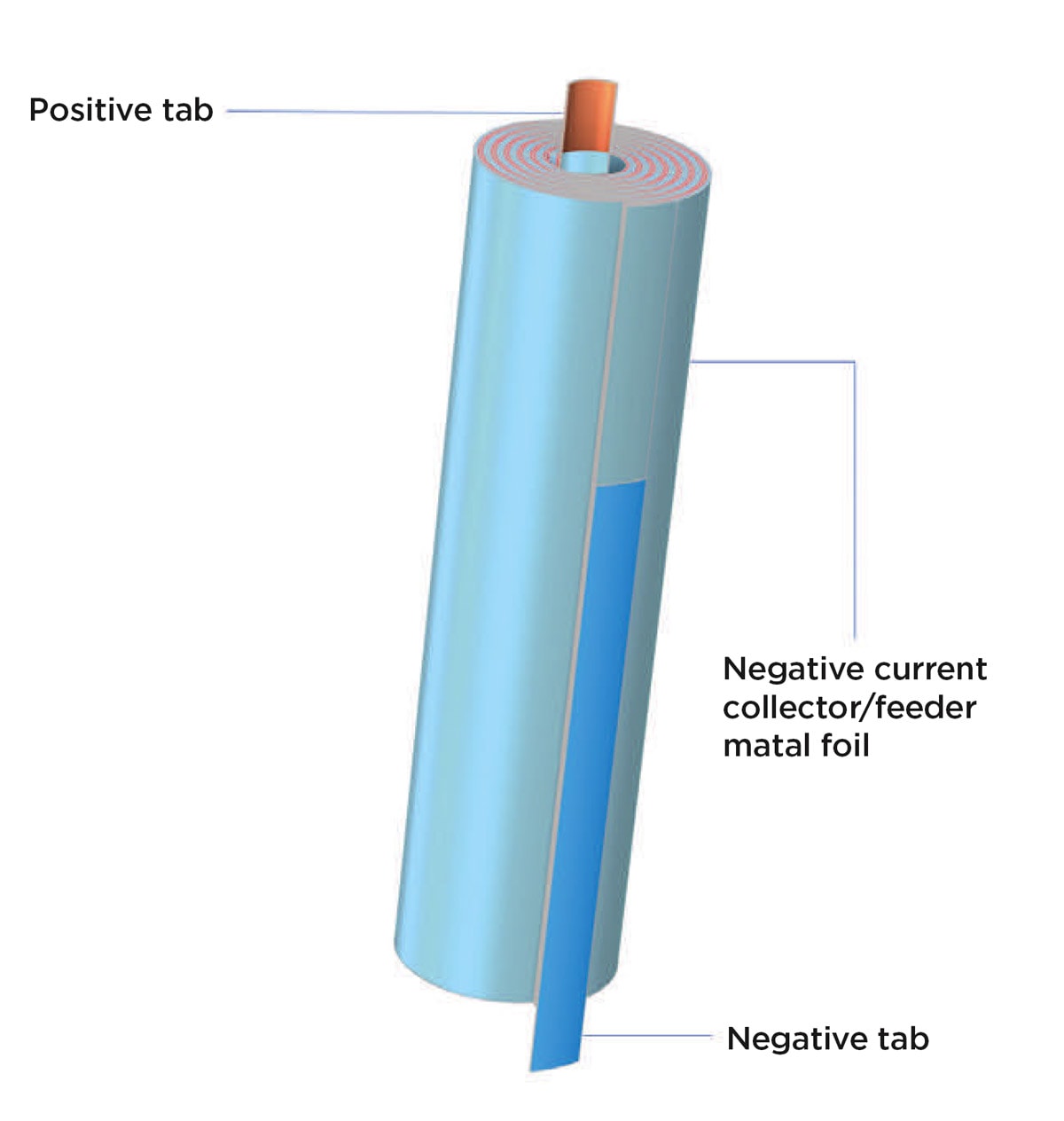 When the jelly roll is inserted into the can, the negative tab is folded to make contact with the bottom cover, while the positive tab makes contact with the top cover (Figure 1).