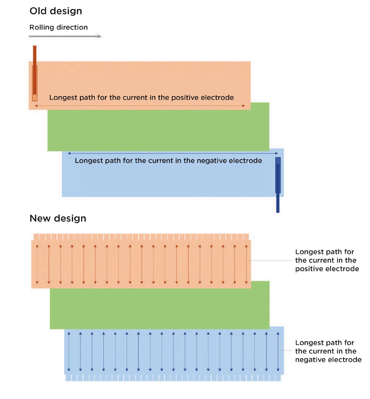 The cuts allow the tabs to be folded without wrinkling the foil when the jelly roll is rolled. [2] The shorter path for the current, as shown in Figure 3, not only makes it possible to design cells with larger radii, but it also allows for cells with greater height, which adds some freedom in the pack design. In addition, the metal foils have excellent thermal conductivity, which enables greater control of the temperature of the cell.