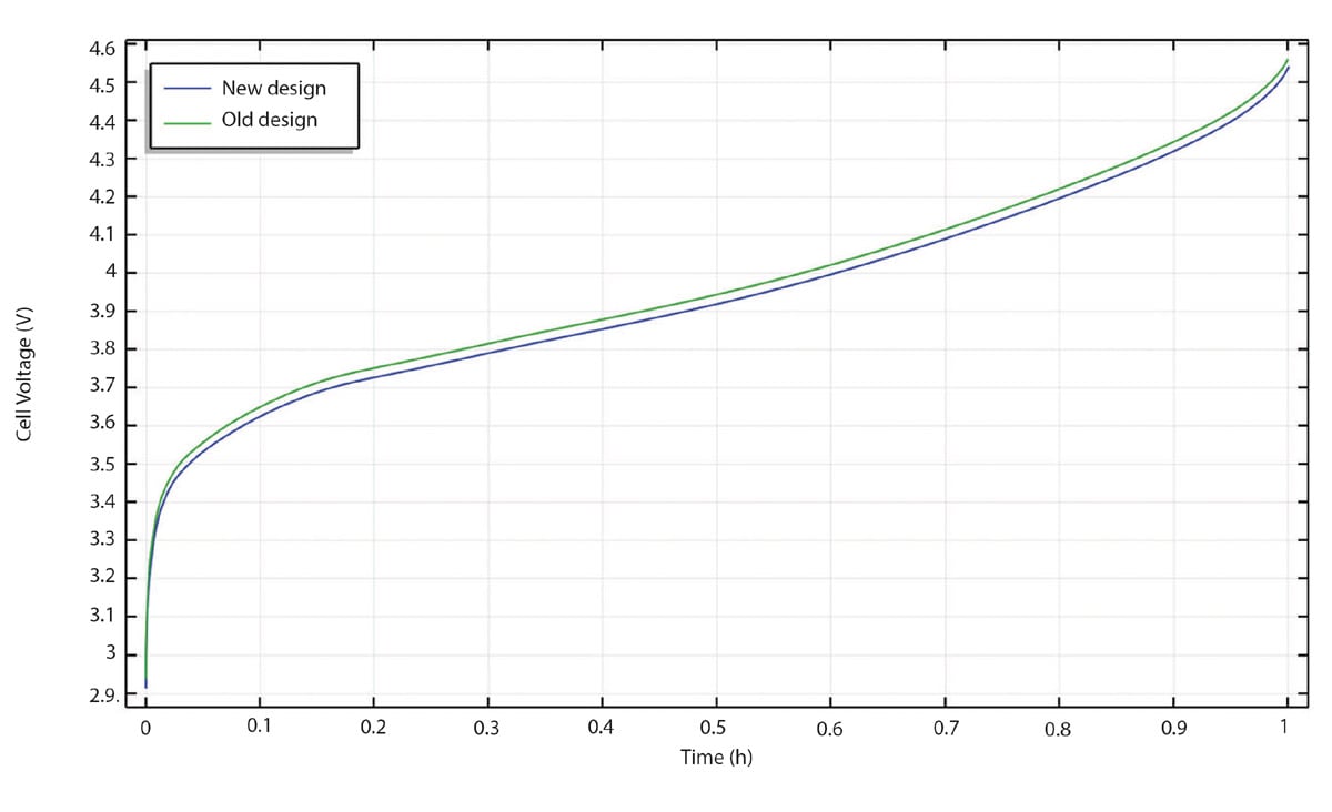 To investigate the performance of the two designs, we will use a Newman model for the lithium-ion battery, which is the most accurate model for this battery. [4,5] We will select the 18650 type of cell, i.e., the smaller cell, for our models. Even for this smaller cell, the comparison between the old and new design should demonstrate the trend in performance.