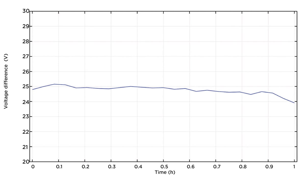 Now, let us look at Figure 6 to compare the recharge curves for the old and new design. We can see that the new design performs better. If we plot the difference in potential between the two curves in Figure 6, we can see that the improvement is almost constant over the whole recharge process, as shown in Figure 7. The new design performs about 24-25 mV better over the whole recharge period, which is a substantial improvement.