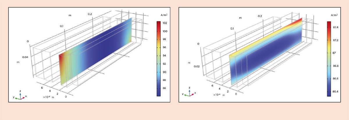 However, for a battery subjected to dynamically shifting charges and recharges, such as for a car undergoing repeated acceleration and regenerative braking, the nonuniform current distribution is of importance: It results in nonuniform utilization of the battery, which accelerates aging. With the new design, the current density is much more uniform, with a difference of only 1.3 percent between the largest and smallest value (Figure 8).