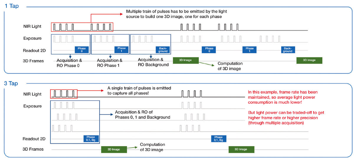 Using a multiple-tap pixel sensor, for instance, a 3-tap pixel for the example shown, all exposures and readouts are made in an interleaved way, so that all phases are acquired virtually in parallel, minimizing motion artifacts. Furthermore, since the phases can be captured with a single train of light pulses, it reduces the average light power, which is important both from an eye-safety and power consumption point of view.