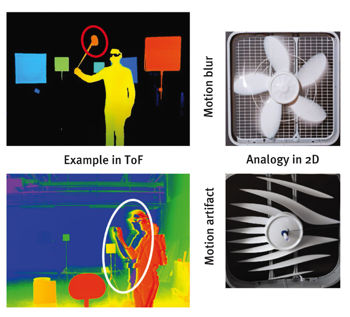 Note that the difference between a motion artifact and motion blur is similar to the difference between rolling and global shutters in 2D vision. Motion blur can slightly warp the objects, which are moving fast but it does not provide false information, while motion artifacts can drastically change the appearance of the objects and provide false measurement, which can have major consequences in some applications.