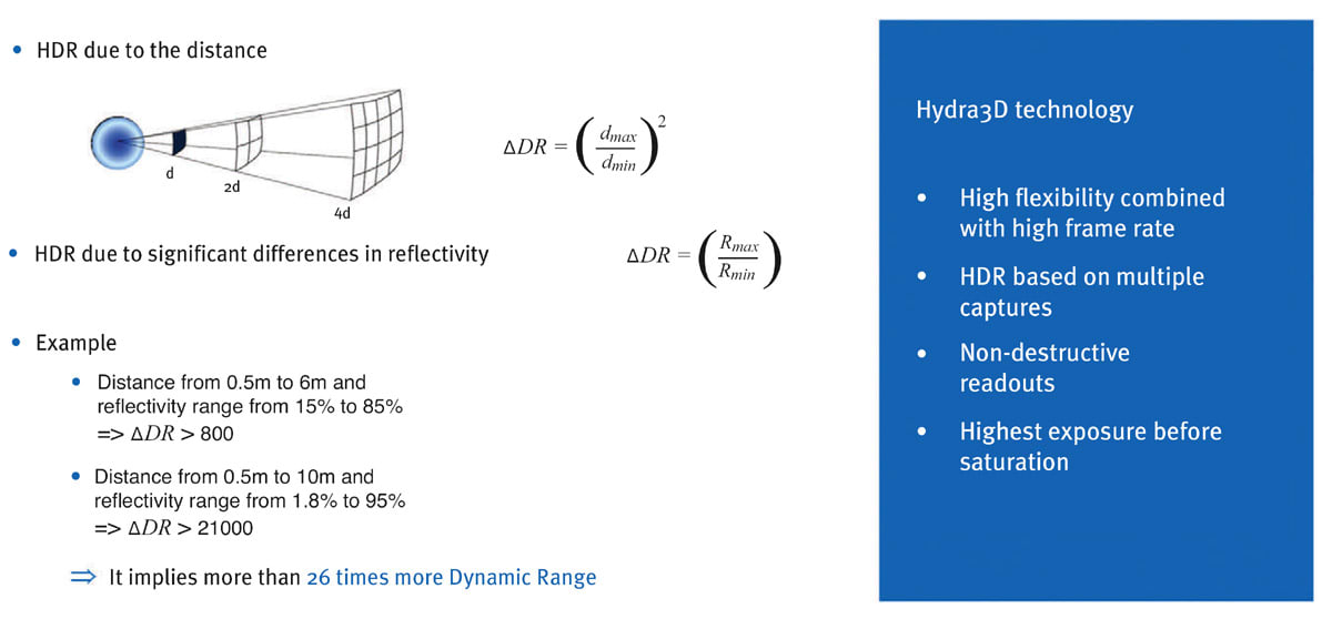 Teledyne e2v’s Hydra3D ToF CMOS image sensor embeds specific techniques to manage this huge dynamic range, such as non-destructive readouts based on multiple captures combined with a high frame rate, making it suitable for most application cases.