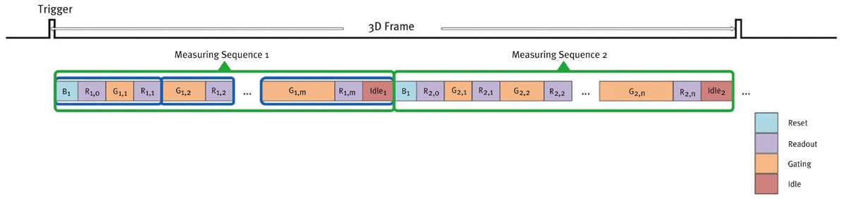 The first blue outlined rectangle is the exposure and readout of the three phases, resulting in one 3D image. Multiple acquisitions (blue outline rectangles) can be done in each measurement sequence (green outline rectangles), either to increase the dynamic range or to improve the precision. Also, having multiple measuring sequences allows measurement at different distance ranges, or with different levels of precision, or to perform 2D captures. This happens all with a single trigger. On top of that, the sequence is changeable from frame-to-frame, live, without halting the sensor.