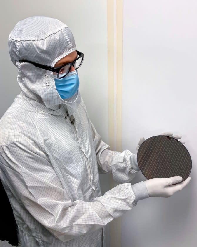 The finished circuits arrived on 8-inch silicon-on-insulator wafers. At 15 microns tall, each robot brain — essentially also the robot’s body — was a “mountain” compared to the electronics that normally fit on a flat wafer, said postdoctoral researcher Michael Reynolds. He worked with the Cornell NanoScale Science and Technology Facility (CNF) to develop an intricate process using 13 layers of photolithography to etch the brains loose into an aqueous solution and pattern the actuators to make the legs