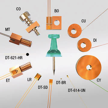 The DT-670 Series silicon diodes from Lake Shore Cryotronics, Westerville, OH, offer high accuracy over an extremely wide temperature range. DT-670 sensors in the SD package are available in four tolerance bands — three for general cryogenic use across the 1.4 K to 500 K temperature range, and one that offers superior accuracy for applications from 30 K to room temperature. The small size and fast thermal response of the bare die sensor, the DT-670E-BR, are an important advantage for applications where size and thermal response time are critical, including focal plane arrays and high temperature superconducting filters for cellular communication.