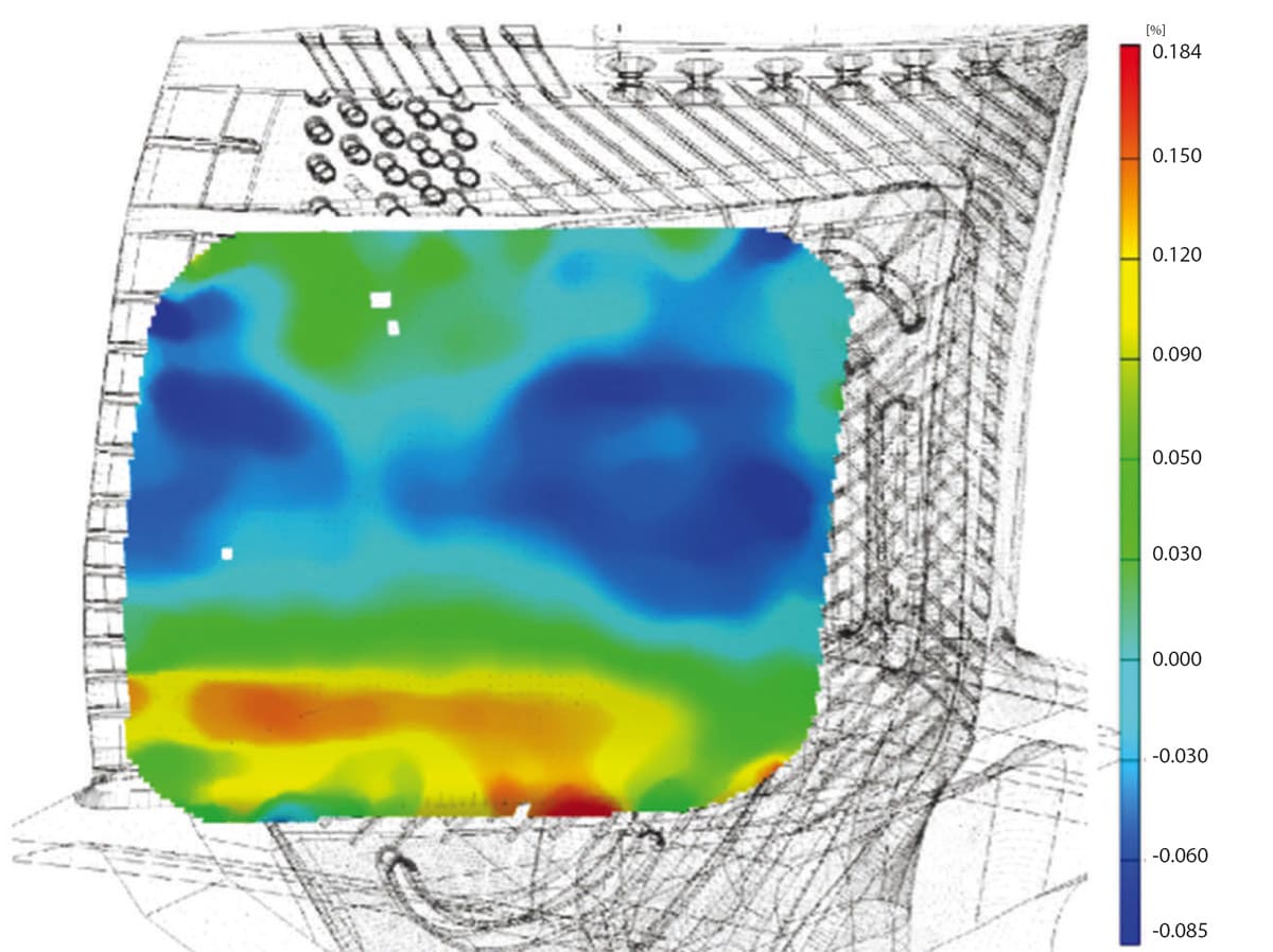 NIAR calls optical strain the FEA of testing because it provides the continuous 3D deformation and strain field across the complete structure. It actually measures the 3D coordinates of each point across the surface of structure, which is the 3D shape, and the changes are the 3D displacement of the structure, with local displacements being strain. In 3D, these local displacements become the full strain tensor of material response, as if you had 10,000 rosette strain gauges in each field of view; each field of view is worth $1M of strain gauges.