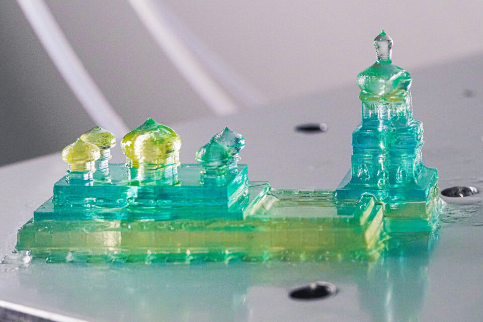 With the additional resin injection, iCLIP aims to print with multiple resin types throughout the printing process. The researchers tested the printer with as many as three different syringes, each with a different-colored resin. They successfully printed models of famous structures from different countries in the color of each respective country’s flag.