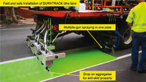 The coating offers a new solution to the durable green bike lane market. It has no odor, low volatile organic compound, is easy to handle with and clean up with water. The DURATRACK coating comprises of two resins R-100 and AEH-100. This special design enables the coating system to have a lower viscosity, longer pot-life, and better UV durability than typical epoxy coatings.