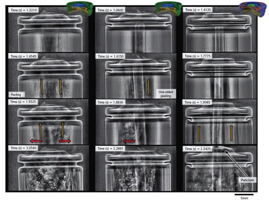 At a specific temperature, the separator in the first few layers of the cell melts allowing the anode and cathode to make contact and initiates an internal short circuit. The internal short circuit then propagates throughout the battery eventually causing thermal runaway.