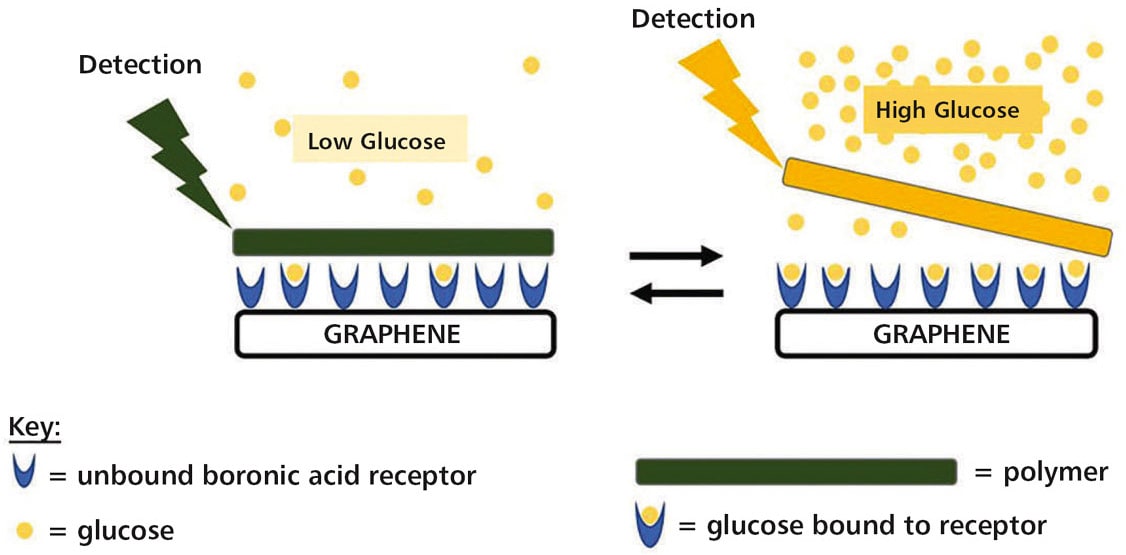 The sensor is based on the chemical, boronic acid, which is attached to a graphene foam surface. An electroactive polymer layer is added on top and binds to the boronic acid. When glucose is present, it competitively binds to the boronic acid, displacing the polymer. The sensor produces an electric current proportional to how much polymer is displaced, meaning that the concentration of glucose in the sample can be accurately measured.