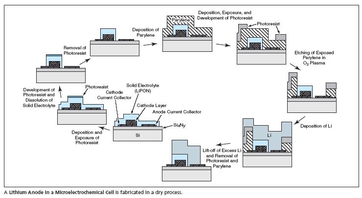 The need for this special process arises because lithium engages in undesired chemical reactions with water and with most of the chemicals commonly used in the microfabrication of silicon and other materials. The method described below involves the use of only water-free “dry” chemicals that are compatible with lithium. The figure illustrates the pertinent steps in the fabrication of a microelectrochemical cell containing a lithium anode.