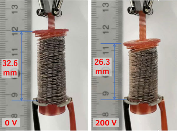 In tests, the ferroelectric liquid crystal was found to generate forces across electrodes that were 1,200 times higher than that of conventional paraelectric materials such as insulating oils. With the ferroelectric liquid crystals and a 3D-printed double-helical coil electrode, the researchers developed an electrostatic actuator capable of producing contraction and expansion — like muscles would — at low voltages. "When we applied an electric field of 0.25 MV m-1, the device contracted by 6.3 mm, which is about 19% of its original length," said Prof. Nishimura. "Visual observation showed that the device moves when a voltage of 20 V is applied. This means that even a dry cell battery can power the present actuator."
