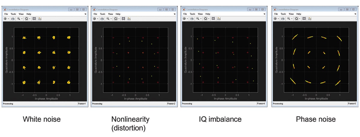 To avoid the impact of signal degradation on design performance, device designers need to overcome the physical challenges present in wide bandwidth and high-frequency signals. Measurement and characterization of signal quality require test solutions with better performance than the device under test (DUT) without introducing new signal impairments. In Figure 1, see examples of IQ modulation impairments that cause constellation symbols to deviate from their defined locations. These deviations provide information about the nature of the impairments based on the type and intensity of deviations.
