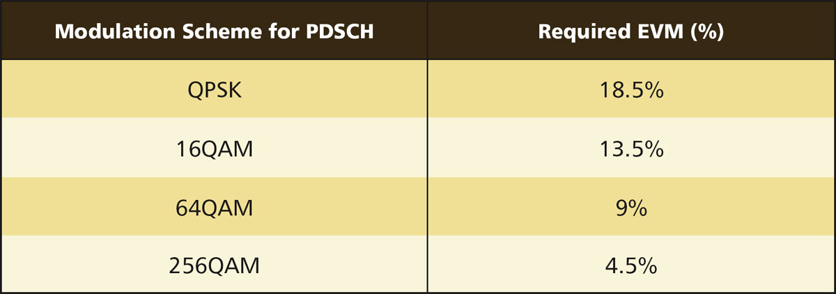 EVM measurements during conformance testing verify modulation quality is within the limits specified by the minimum requirements. Antenna connectors and transceiver array bound (TAB) connectors must meet the minimum requirements when testing one at a time or in parallel. It is necessary to repeat tests for all antenna and TAB connectors. For example, EVM for NR carriers of different modulation schemes on a physical downlink shared channel (PDSCH) must demonstrate less than the limits that appear in Table 1. It is necessary to perform EVM measurements for all bandwidths on all allocated resource blocks and downlink slots within 10 ms measurement periods.